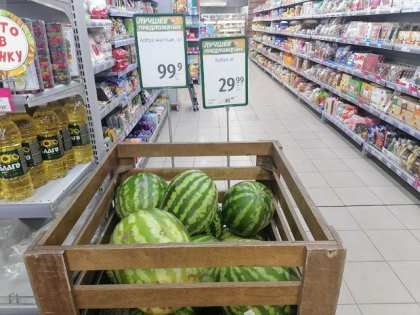 В сети «Слата» арбузы есть, но не так уж и много. Сотрудники торгового зала говорят: сезон закончился, уже почти не везут, распродаются остатки. Они, конечно, сладки, и цена вполне приемлемая: 29 рублей за кило красных арбузов и 99 рублей — за жёлтых «собратьев». Дыни «торпеда» по 99 рублей за кило, китайские зелёные — по 139 рублей, «колхозницы» — по 119 рублей. Жёлтые и красные арбузы лежат в одной коробе и ничем не помечены. Говорят — не перемешивают, да там и не перемешаешь, все плоды по 7-10 килограммов. Вот только на видимых арбузах мы нашли вмятины, на одном — трещину. В целом, нужно присматриваться и хорошенько проверять.