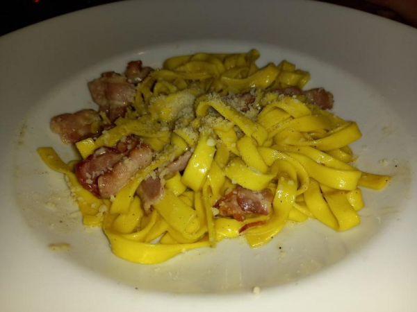 «Карбонара» — традиционное итальянское блюдо, в состав, которого входят спагетти, сырно-яичный соус, хрустящие ломтики бекона и немного тёртого сыра «Пармезан». В ресторане же представлен не классический рецепт пасты — вместе с яйцами добавляют сливки, хотя итальянцы не допускают использование этого ингредиента. Несмотря на это, журналисты Бабра остались довольны блюдом, макароны приготовлены до нужной степени, бекон хорошо прожарен, а сливки совсем не испортили вкус. Пусть повара готовят не по оригинальному итальянскому рецепту, но готовая паста действительно вкусная.