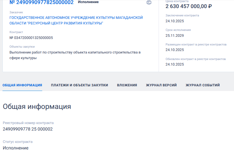 24 октября 2025 года Государственное автономное учреждение культуры Магаданской области «Ресурсный центр развития культуры», подконтрольное Минкультуры Магаданской области, подписало контракт на строительство музея в районе Горохового поля Магадана по максимальной цене - 2,63 млрд рублей. В торгах участвовала единственная компания, за которой может стоять семья олигарха Несиса, - ООО «Идефикс». ОБ ЭТОМ СООБЩАЕТ NEWSBOOM