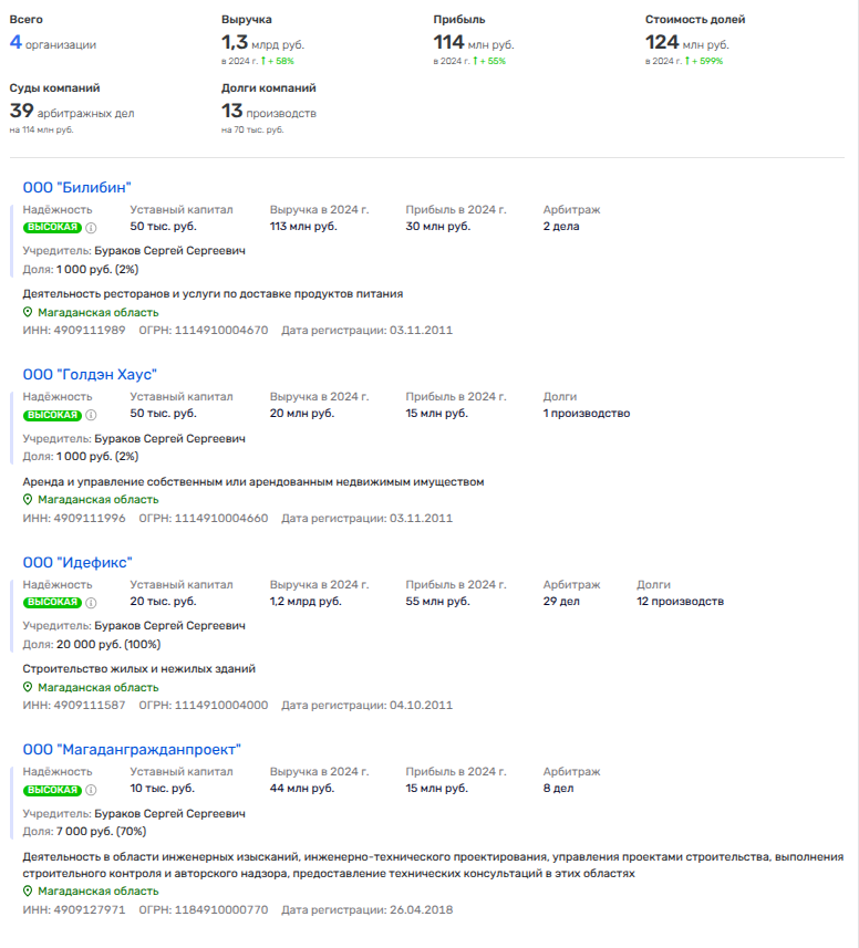Владельцем ООО «Идефикс» выступает Бураков Сергей Сергеевич, в бизнес-портфеле которого еще три фирмы, включая ООО «Магадангражданпроект», ресторанное ООО «Билибин» и ООО «Голдэн Хаус». В двух последних его партнёром выступает Светлана Несис - жена брата золоторудного олигарха Александра Несиса, который сам ушел в тень, предпочитая наблюдать за пополнением своего кошелька, попивая виски на теплом бережку где-нибудь на французской Ривьере.