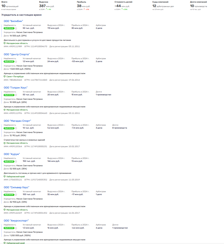 Светлана Несис раскинула бизнес-сеть по стране от края до края - от Хабаровска до Петербурга, выжимая капиталы на строительстве, ресторанно-гостиничном бизнесе, обороте недвижимости. Помогают ей в этом бывшие наемные работники из структур Polymetal - той кубышки, где ее семья имела или до сих пор имеет некий процентик. Например, партнером мадам Несис по ООО «Пасифик Рим» из Совгавани является Сергей Черкашин, получивший образование в Университете г. Хартфорда (University of Hartford, США), а самое главное - он с 2023 года является гендиректором АО «Полиметалл».