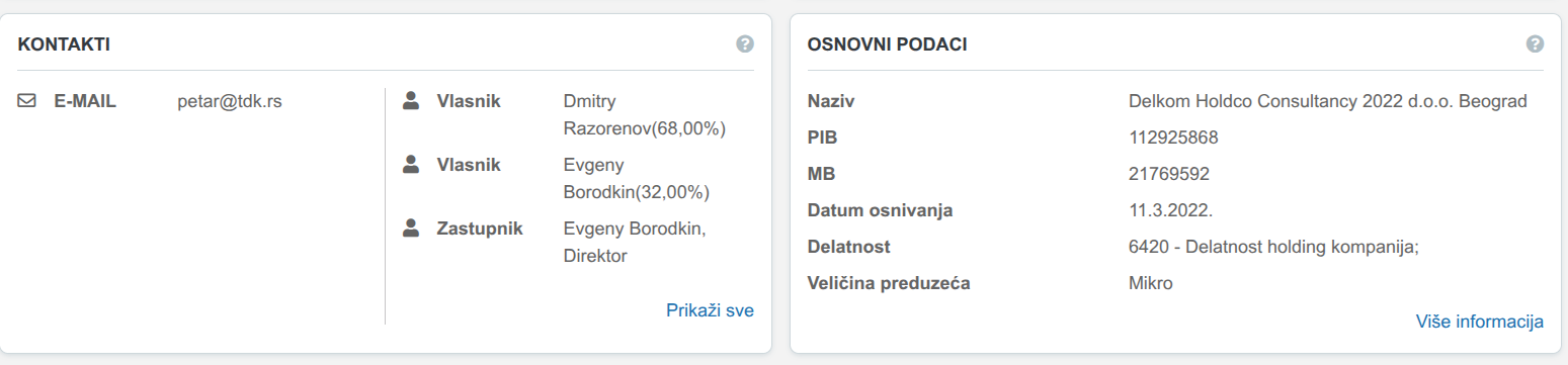 А самое главное в этой свеженькой горнорудной фирме то, что одним из владельцев - компания ДЕЛКОМ ХОЛДКО КОНСАЛТАНСИ 2022 Д.О.О. БЕЛГРАД из Сербии. Очередной выводной бачок семьи Несис под прикрытием некоего Dmitry Razorenov - частного инвестора, бывшего топ-а ВТБ и экс-депутата Ачинского городского Совета депутатов Evgeny Borodkin? Именно эти двое числятся владельцами сербской фирмы.