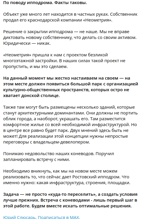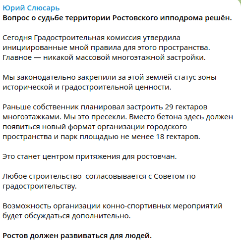 Спустя две недели появилось еще одно сообщение Слюсаря о судьбе ипподрома, где он обещает, что никакой массовой многоэтажной застройки не будет, а земля получила статус зоны исторической и градостроительной ценности.