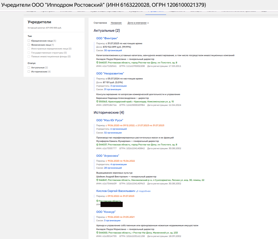 Компанию «Неоразвитие», на которую были выкуплены ООО «Конкур», «Ипподром Ростовский» и «Финтрек» (на него частично оформлен ипподром), создали в апреле 2024 года. То есть буквально за несколько месяцев до сделки.