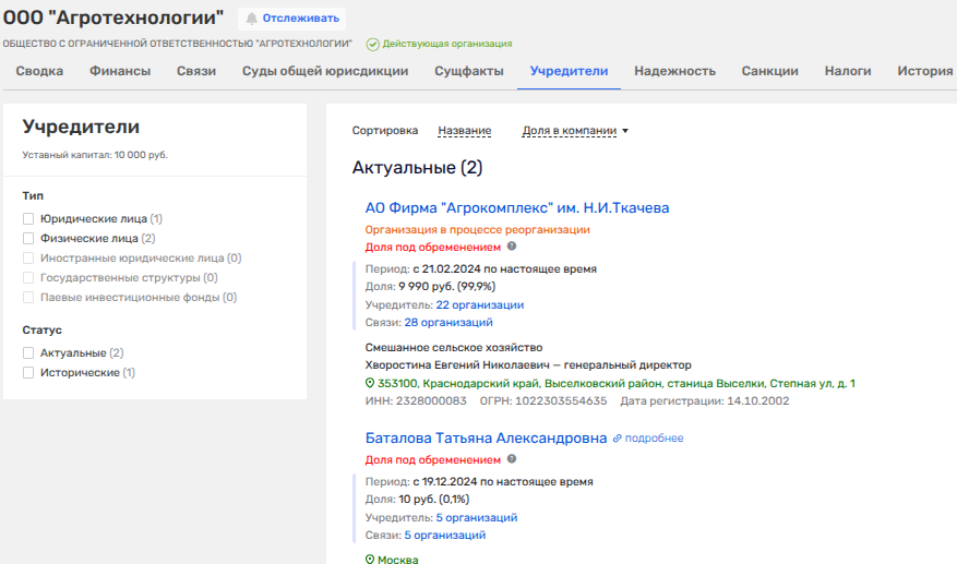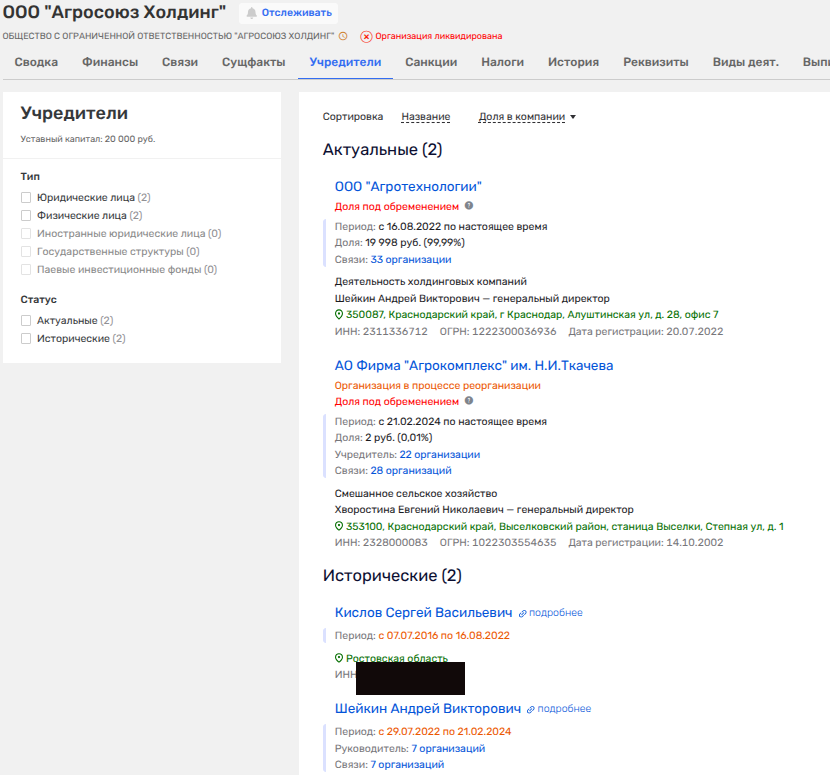 Но, помимо Кислова, в истории с ипподромом засветилось и ООО «Агросоюз», которое связывало его с семьей бывшего губернатора Кубани, экс-главой Минсельхоза РФ Александром Ткачевым. В цепочке связей, идущих от ипподрома мы видим, например, АО Фирма «Агрокомплекс» им. Н. И. Ткачева.