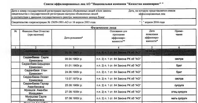 А ещё, согласно согласно опубликованному KASE в 2016 году списку аффилированных лиц нацкомпании «Казахстан инжиниринг», Сауле Мухашова — это тёща Нурлана Сауранбаева.