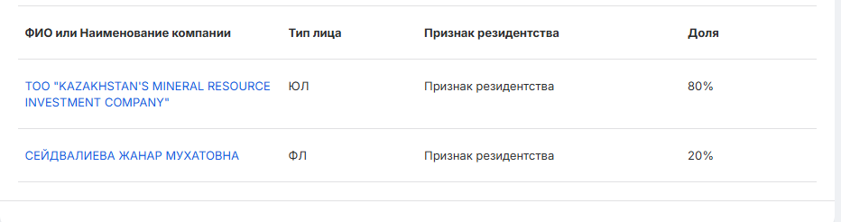 Однако, согласно данным сервиса Kompra.kz, кроме трёх учредителей, с Kundybai Mining аффилированы ещё несколько человек. Это, в частности, нынешние первые руководители компании самой Kundybai Mining и Kazakhstan’s mineral resource investment company Руслан Хасанов и Нурсултан Азизбеков. Но не только они.