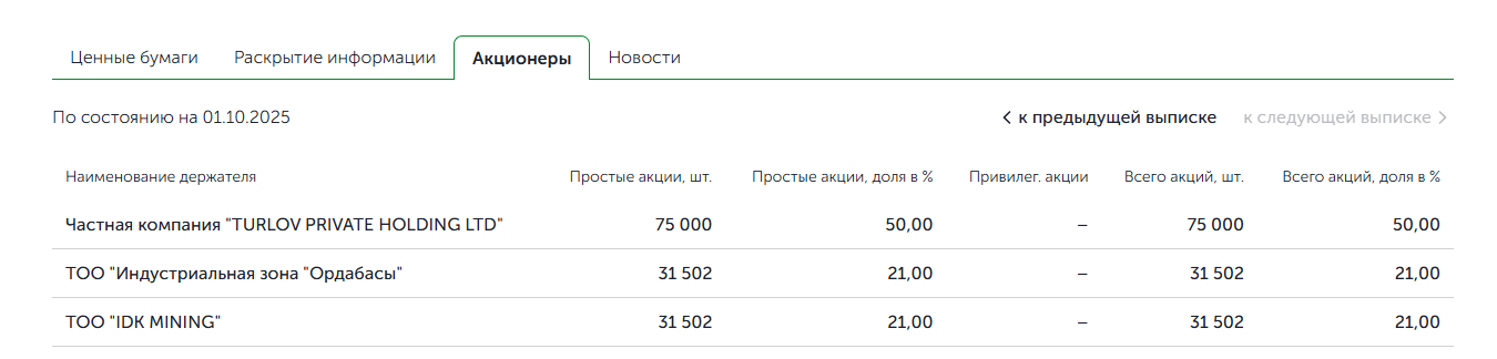 Всё в тех же документах в качестве владельца 80 % акций указана компания Kazakhstan’s mineral resource investment company. Она в разных долях принадлежит нескольким людям. Через холдинг Joint Resources — Тимуру Кулибаеву. Он его единственный владелец. Второй учредитель — ТОО «Orda Mining», в учредителях которой значатся миллионер Динмухамет Идрисов и его партнёр Мальгаждар Карин.