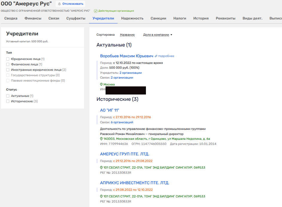Само ООО «Амереус Рус» напоминает техническую компанию, используемую для вывода капиталов: выручка и прибыль - копейки, но сама фирма существует уже 9 лет, притом, что в ней официально 0 сотрудников. Но при этом её оценивают в 156 млн рублей, а до октября 2022 года (то есть до СВО) владельцами фирмы выступали сингапурские кубышки - АМЕРЕУС ГРУП ПТЕ. ЛТД и АПРИКУС ИНВЕСТМЕНТС ПТЕ. ЛТД., через которые вполне на определенные счета могли выводить дивиденды. Кстати, АО «ИГ 11» на старте также фигурировало в числе владельцев этой фирмы с сомнительным дном. Уж не капиталы ли Самолета уплыли через нее в Сингапур?
