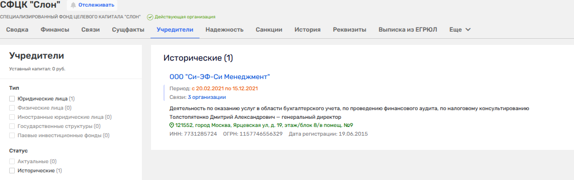 Помимо этого, Ксения Турчанинова - директор некоего мутного СФЦК «Слон» по управлению активами. Учредителем оного выступало ООО «Си-ЭФ-Си Менеджмент», на старте которого наследил Антон Елистратов - бывший гендиректор Самолета. Как вам такой расклад?