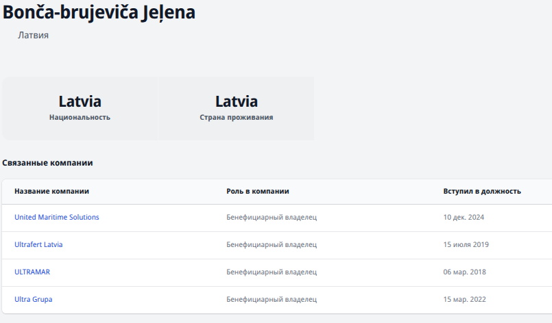 Так, ранее в числе владельцев ООО «Ультрамар» было и латвийское Ультрамар. В Латвии же на сегодня работают связанные между собой United Maritime Solutions, Ultrafert Latvia, ULTRAMAR и Ultra Grupa, чьим владельцем является родня г-на Бонч-Бруевича - Bonča-brujeviča Jeļena. Именно эта дама обеспечивает ручейки на ту сторону.
