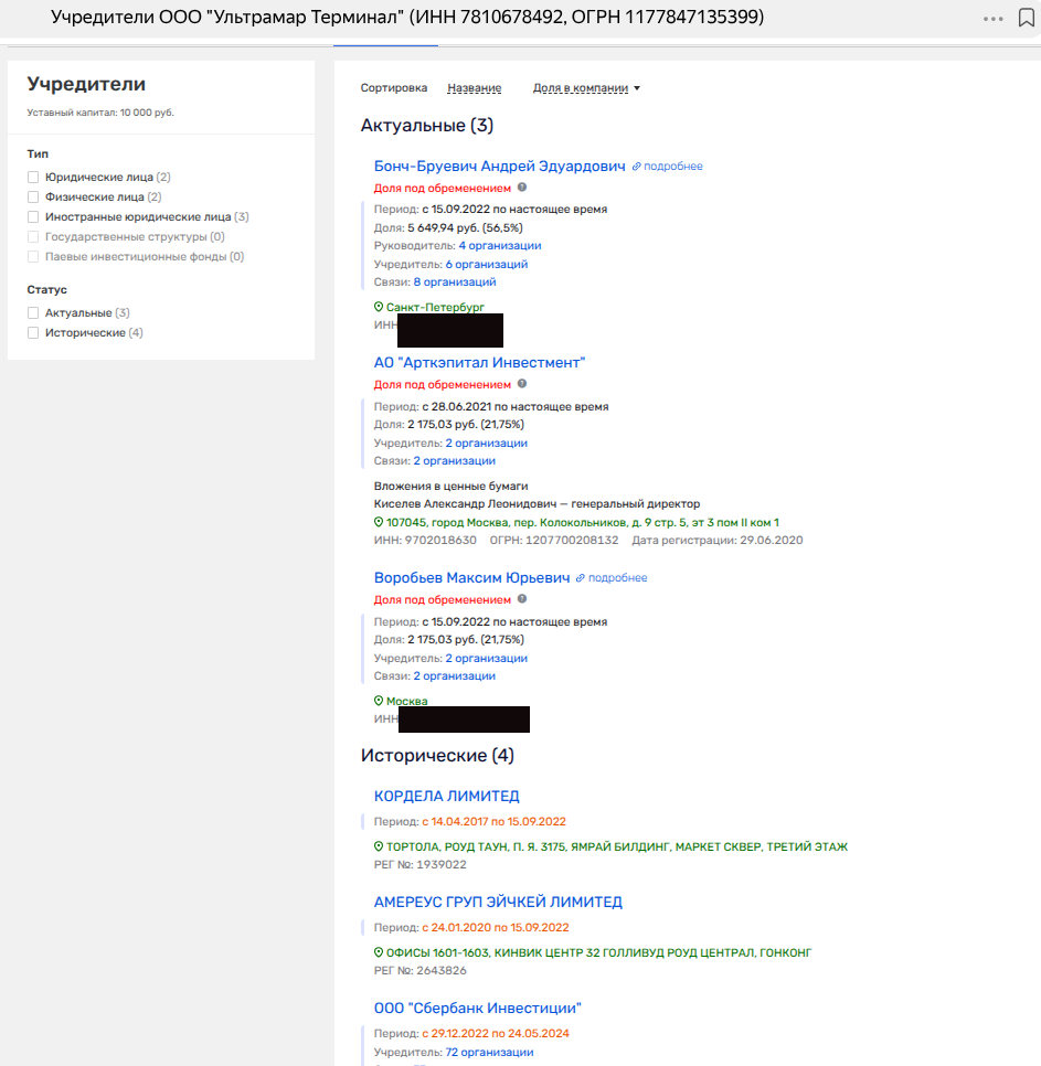 Видимо, понимая риски, Максим Воробьев начал ранее прятать и эту часть своего бизнеса. Так, в конце июня 2025 года брат губернатора вышел из состава владельцев ООО «Ультрамар» - логистического оператора из Ленинградской области, который специализируется на перевозке минеральных удобрений и имеет офис в Риге. Там же вместе с ним партнерами выступали Дмитрий Аркадьевич Голубков - депутат Мособлдумы и он же партнер по Самолету, дочка Сбера - «Сбербанк Инвестиции», некая мутная шарашка АО «Арткэпитал Инвестмент» с подставным учредителем и Андрей Бонч-Бруевич. Последний не только является контролирующим лицом, но и именно его семейство обеспечивает связи непосредственно в Латвии.