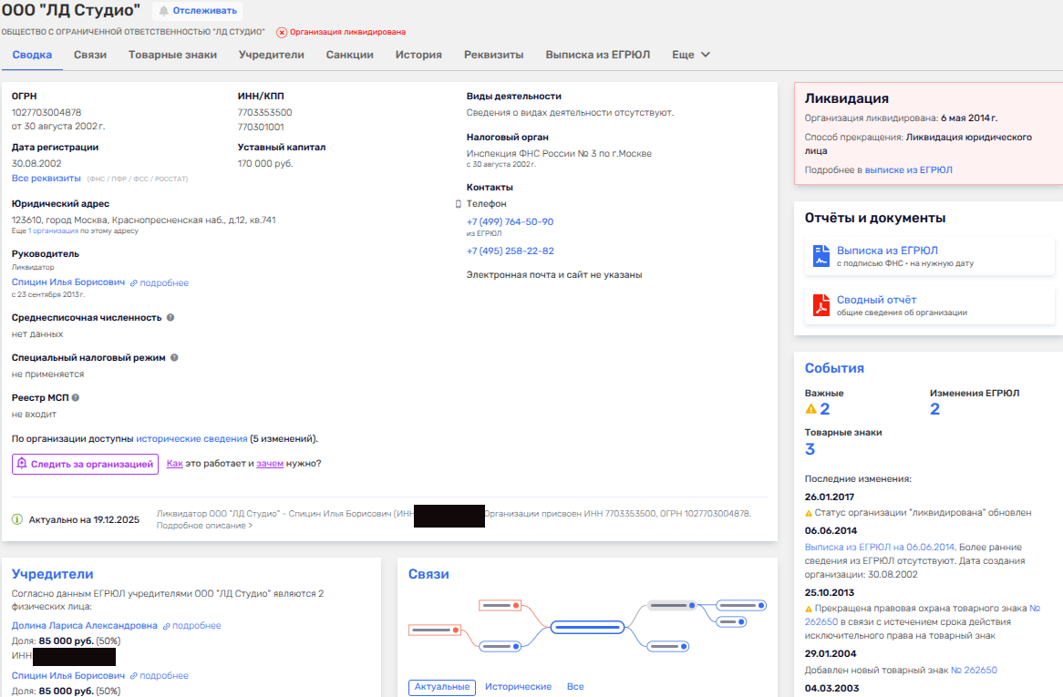 Сейчас Спицин, с которым Долина сообща владела ООО «ЛД Студио» (ликвидировано в 2014 году), а ее дочь - Ангелина Миончинская - ООО «Строй-Альфа», глава целых трех юрлиц в хоккейной сфере.