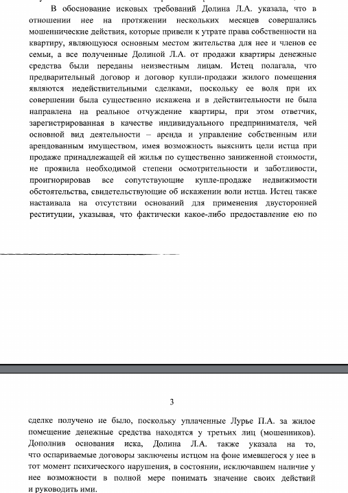 Например, Долина требовала расторгнуть сделку, но деньги не готова была возвращать, так как отдала их мошенников (те действительно были, но уже получили свои сроки за этот и другие эпизоды). Вот только деньги от покупателя она получала сама, а куда потом их дела - это ее личное дело. Хоть серпантин нарезала.