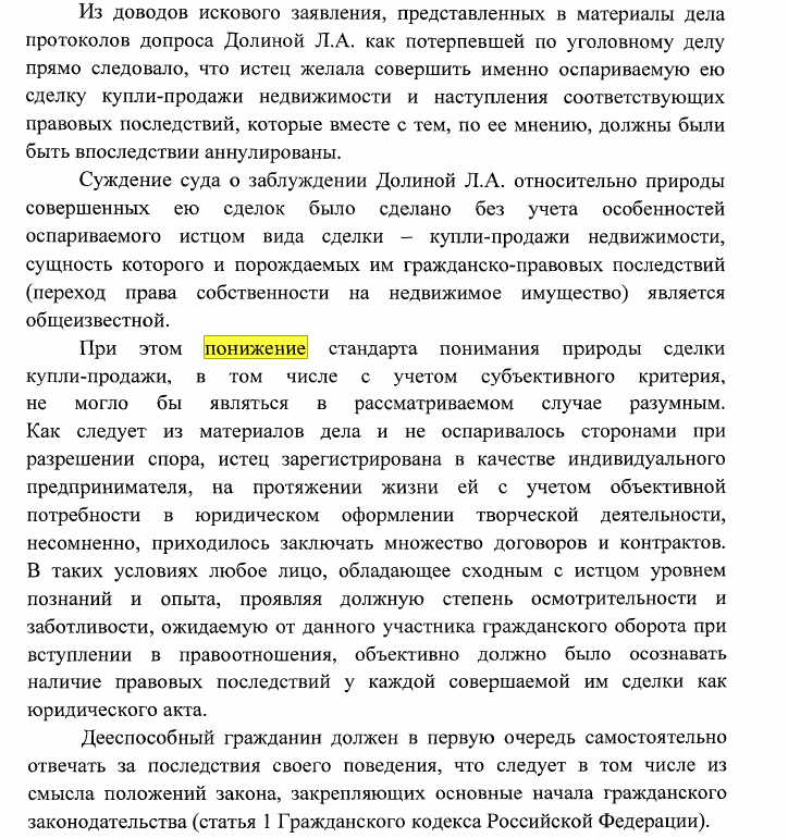Во-первых, верховные судьи указали, что младшие коллеги, признавая сделку недействительной как совершенную под влиянием существенного заблуждения, применили логику не правовую, а гуманитарную. То есть сама Долина понимала, что подписывает договор купли-продажи жилья и осознавала переход права собственности, но делала это для выполнения инструкций мошенников. То есть, ошибка в мотивах не делает сделку порочной.
