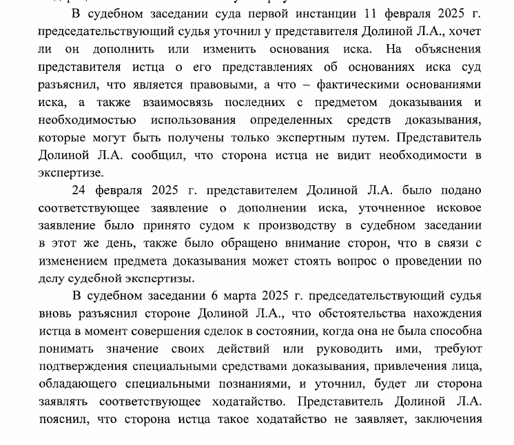 Во-вторых, попытка признать продавца «не способным понимать значение действий» запнулась о поведение защиты, которая то просила экспертизу, то говорила о ее ненужности. При этом экспертиза из уголовного дела не равна судебной психиатрической экспертизе сделкоспособности.