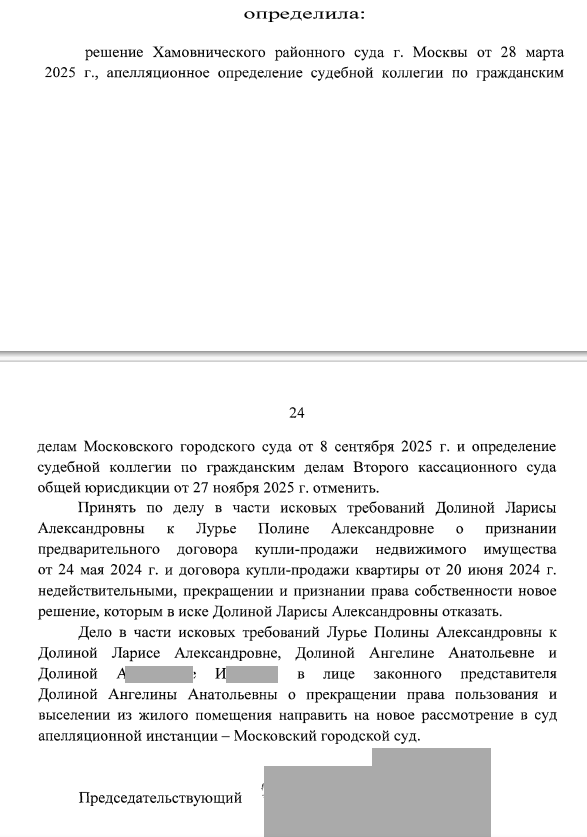 Напомним, в мае 2024 года Долина продала свою квартиру в Хамовниках площадью 236 кв.м за 112 млн рублей, покупателем стала предпринимательница Полина Лурье - мать-одиночка с двумя детьми. Но после сделки певица съезжать из проданной уже квартиры отказалась, заявив, что ее облапошили мошенники, которые и заставили продать жилье. В итоге иск Долиной о признании сделки недействительной со ссылкой на обман мошенников, Хамовнический суд Москвы удовлетворил. Так, имея статус добросовестной покупательницы Лурье осталась и без жилья, и без денег, а по стране прокатилась волна исков с оспариванием сделок. Ситуация получила название схемы Долиной или казуса Долиной, а вторичный рынок жилья залихорадило. Ведь, купив жилье, в любой момент, как оказалось, можно остаться и без него, и без денег. Подстраховаться от этого, глядя в вердикт Хамовнического суда, было практически нереально.