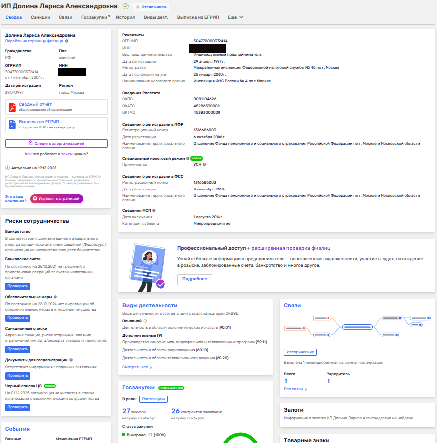 На сегодня Долина в ЕГРЮЛ действительно зарегистрирована как ИП, через которое и проходят многочисленные госконтракты, в том числе и за 2024 год. И подписывает договоры Долина лично!