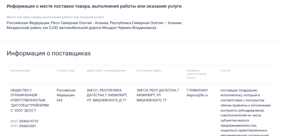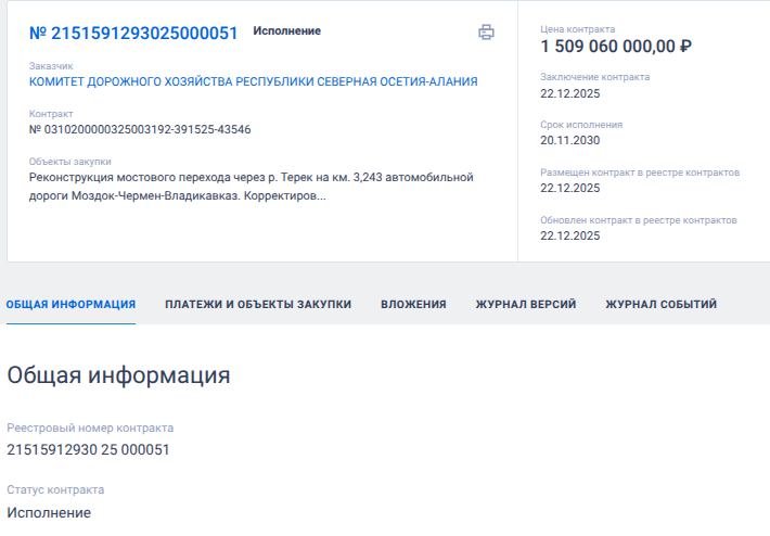 22 декабря 2025 года комитет дорожного хозяйства Северной Осетии - Алании подкинул госконтракт на 1,5 миллиарда рублей на ремонт моста через р. Терек на км 3,243 автодороги Моздок-Чермен-Владикавказ единственному участнику тендера - дагестанской фирме «Дагспецстройсервис».