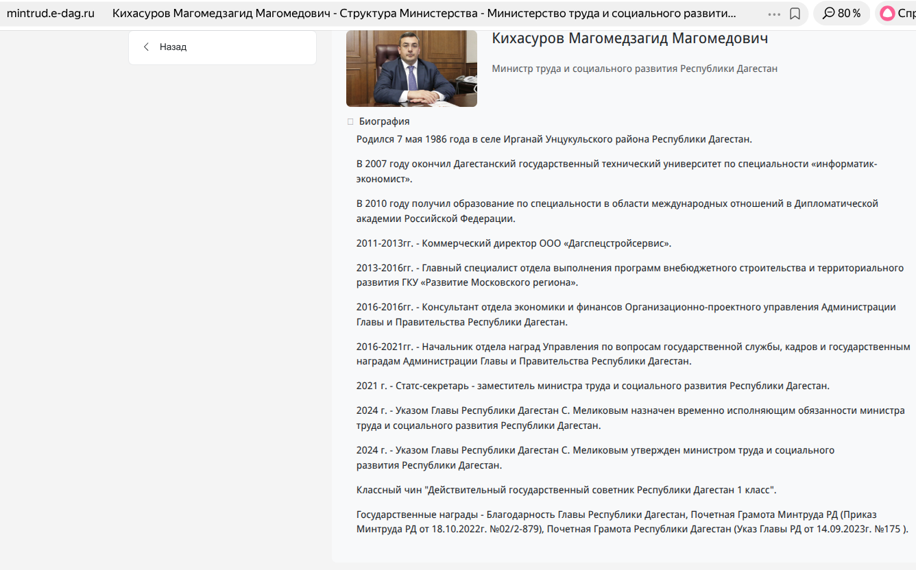 До этого г-н Кихасуров около трех лет отирался в заместителях министра, а до того был мелким, но очень доверенным для главы, клерком в отделе управления по вопросам госслужбы, кадров и госнаград администрации главы и правительства Дагестана, а до того консультантом в одном из отделов той же администрации. И только в 2021 году, когда в кресле главы Дагестана устойчиво обосновался Меликов у Кихасурова карьера резко пошла вверх - из начальника отдела одного из заштатных управлений в заместители министра, а потом и в министры.