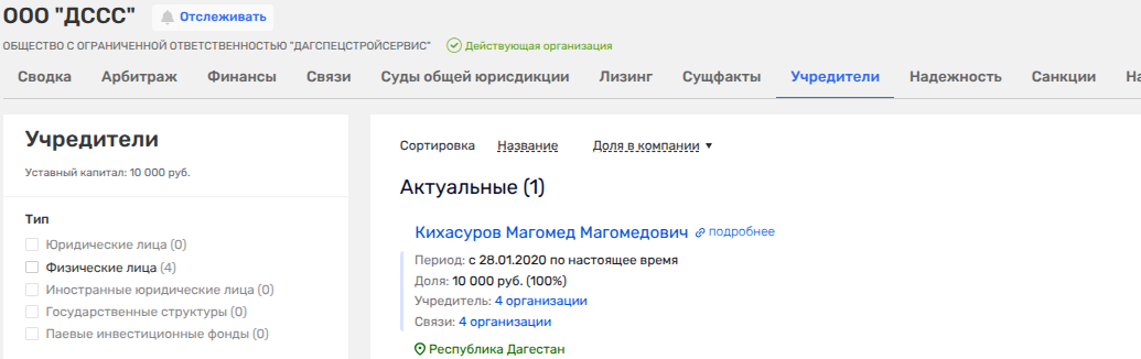Или вот: Абдулгамидов Заирбег Магомедсайгидович, который по ООО «Жилстройкомплект» связан с Магомедовым Абдулмуталимом Муртазалиевичем - бывшим главой администрации Унцукульского района Дагестана и строительного МУП Ирганай. Кроме того, долю в ООО «Дагспецстройсервис» ранее имел некий Магомедов Абас Абдуразакович - вероятно, родственник бывшего главы целого района.