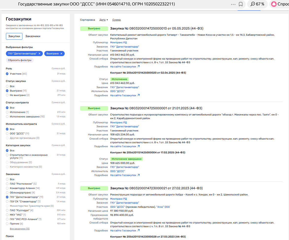 Но вернемся к компании «Дагспецстройсервис», успех к которой пришел как раз таки после назначения в кресло министра протеже Меликова - Магомедзагида Кихасурова. Контракты начали сыпаться на голову ООО как из рога изобилия: так, Дагестанавтодор начал активно в 2024-2025 годы подмахивать фирме крупные господряды. Например, в июне 2025 года на 613 млн рублей.