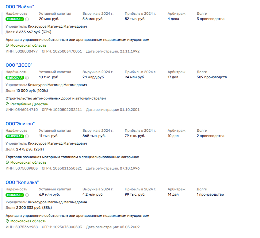 Так, Магомед Кихасуров владеет долями в трех фирмах Московской области - ООО «Эпигон» (розничная торговля моторным топливом в специализированных магазинах), 33% в ООО «Копилка» (Аренда и управление собственным или арендованным недвижимым имуществом) и ООО «Вайма». Через ООО «Вайма» он же имеет долю в другом торговце топливом - ООО «Газсервис-Можайск».