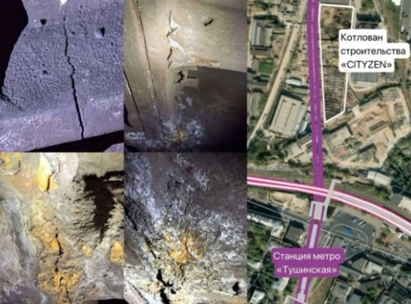 С 2024-го по 2025-й год тоннель метрополитена от станции «Тушинская» до станции «Сходненская» практически был разрушен, и поезд чудом не сошел с рельс. Ниже на фото слева и посередине вы можете увидеть такие трещины внутри тоннеля, что нам, например, по-настоящему страшно теперь спускаться метро. Справа план, на котором мы видим, что стройка находится почти над тоннелем.