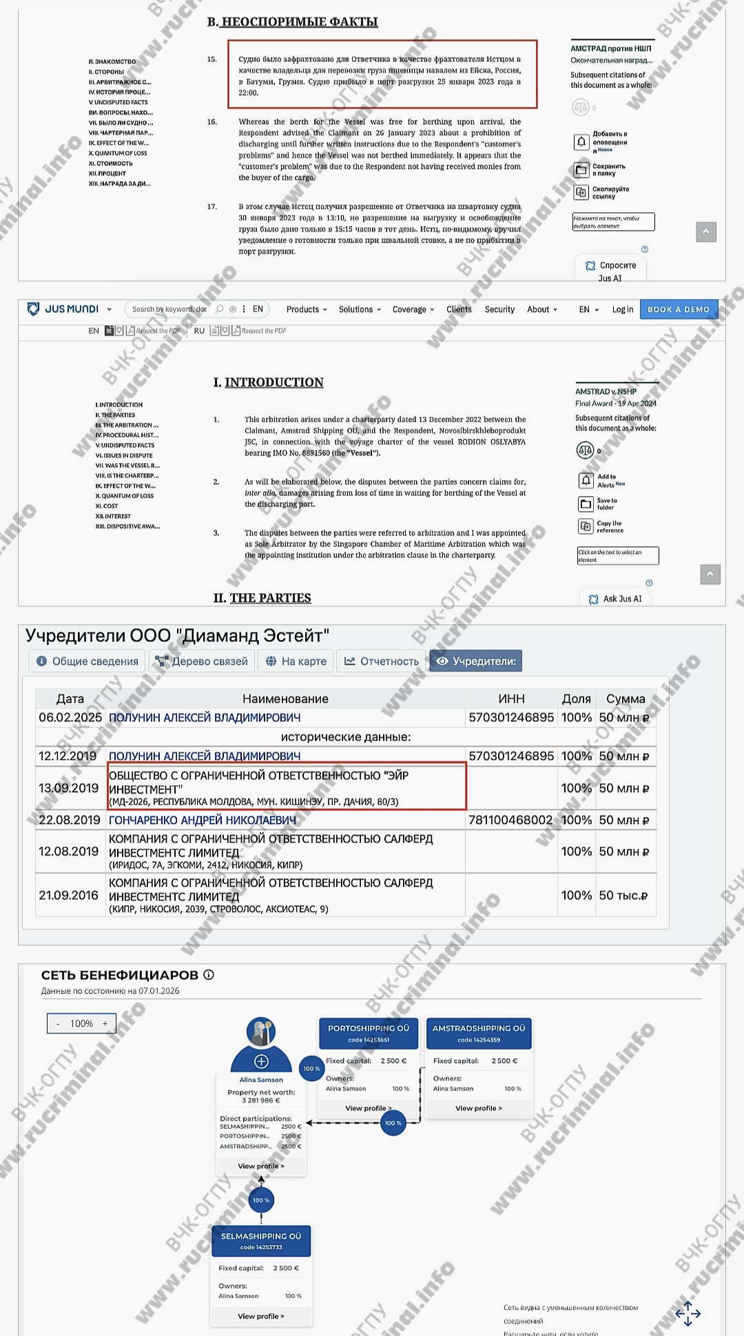 Кроме того, на Алину Самсон с 2017 года записано как минимум три компании в Эстонии: AMSTRADSHIPPING OÜ, PORTOSHIPPING OÜ и SELMASHIPPING OÜ. Они оказывают услуги морских грузоперевозок российскому бизнесу. К примеру, AMSTRADSHIPPING OÜ в этом году пыталась отсудить компенсацию за просрочку разгрузки судна у фрахтователя - «Новосибирскхлебопродукта». Судно «Родион Ослябя» в январе 2023 года перевозило груз пшеницы из Ейска в Батуми (Грузия), это следует из решения сингапурского суда. Украинские журналисты в начале 2024 года выяснили, что украинское зерно через порт Мариуполя вывозят в порты Ростова-на-Дону, Азов, Кавказ и Ейск. Кроме того, этот же сухогруз засветился при перевозке российского санкционного угля в Румынию.