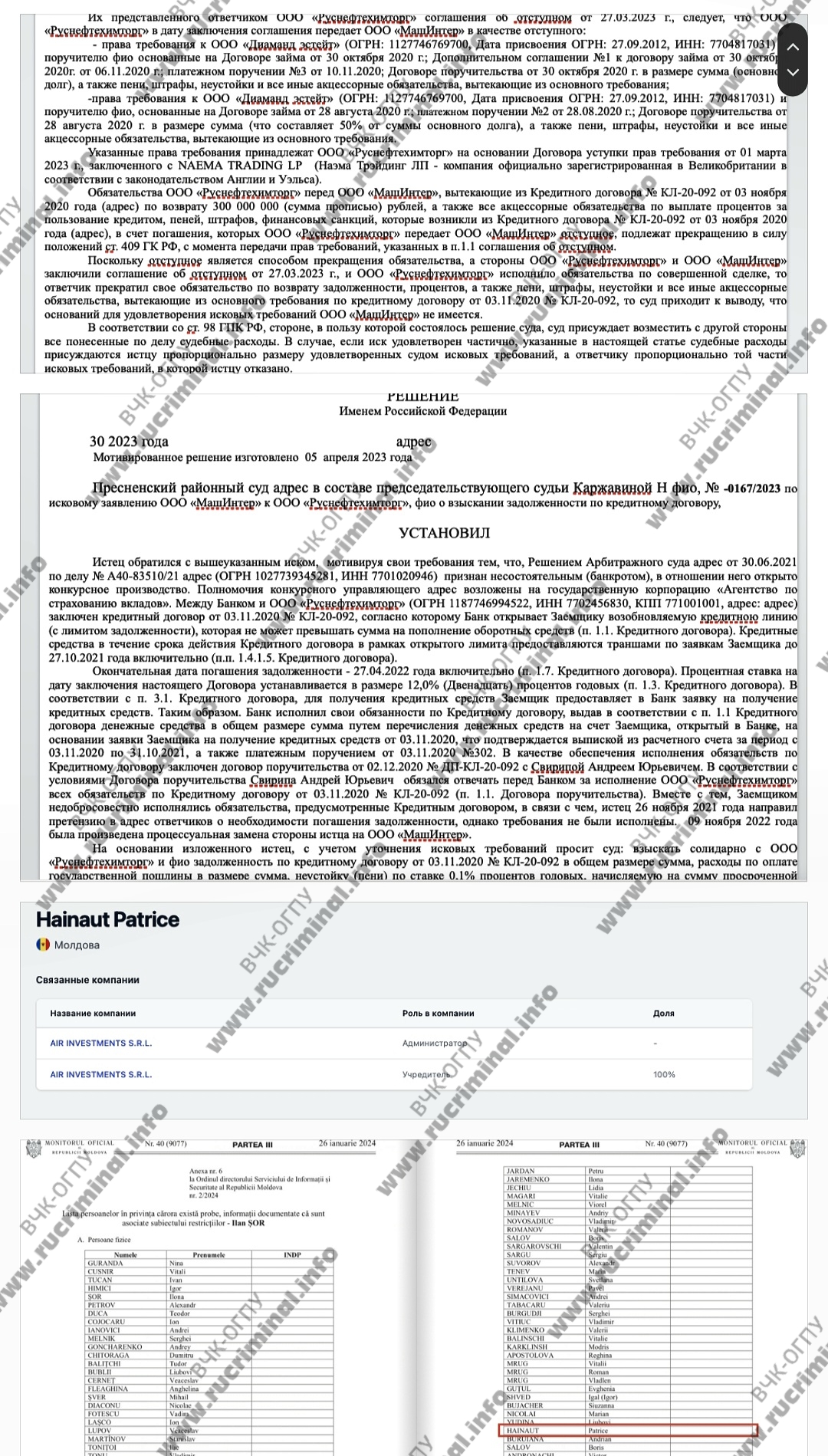 «Диаманд эстейт» сейчас записана на своего директора Алексея Полунина, но до декабря 2019 г. принадлежала молдавской компании AIR INVESTMENTS S.R.L. Ее единственным владельцем, судя по молдавскому реестру, является некий Patrice Hainaut. В 2024 году он был внесен Службой разведки и безопасности Республики Молдова в список лиц, связанных с субъектами ограничений. Кроме того, с октября 2022 года на «Диаманд эстейт» записано 100% компании «Медиа Инвест Сервис», которой ранее владели Игорь Чайка (сын экс-генпрокурора) и молдавский бизнесмен Вадим Чубара - владелец молдавского телеканала Accent TV, друг бывшего президента Молдовы Игоря Додона.