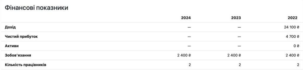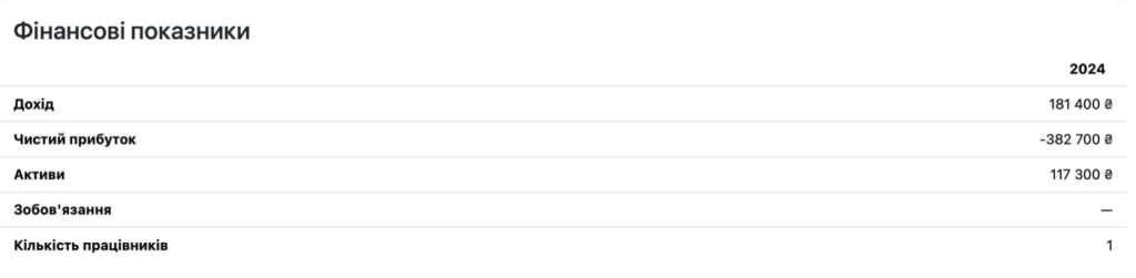 First, the company was created after the apartment was purchased. Second, its 2024 financial report shows a net loss of 382,000 UAH, and the firm officially employs only one person — likely Kaghramanyan himself. It has no website, only six followers on Facebook, and no job listings on employment platforms. In short, there’s zero sign of real activity.