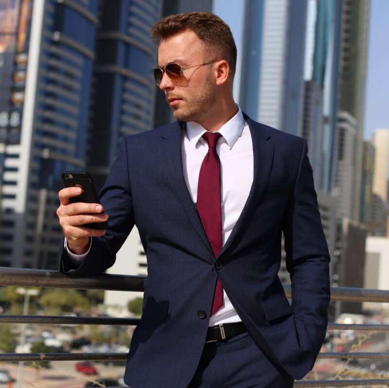 Maksym Bahriiev. Photo: FacebookMaksym Bahriiev in a blue suit and red tie standing in front of modern buildings