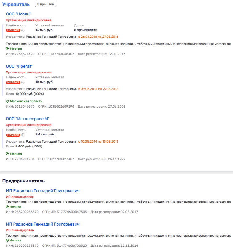 Так, некий Геннадий Радионов был владельцев трёх ныне ликвидированных московских компаний - «Фрегат», «Ноаль», «Металсервис М» и ИП по розничной торговле пищевыми продуктами. Интересно, что, по открытым данным, на компанию «Ноаль» был оформлен товарный знак, связывающий Радионова с сетью «Братьев Караваевых». И вот по этим товарным знакам был указан адрес квартиры в Фурманном переулке. Той же, что фигурировала во французском регистре в связке с SCI MONE.