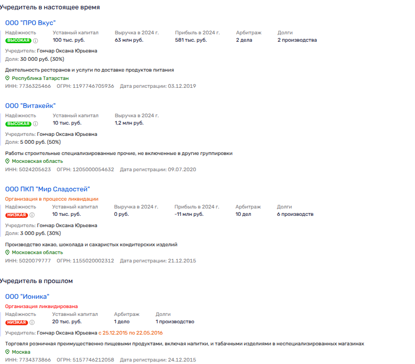 Партнером в фирме Гончар выступает некая Наталья Ломака, получавшая ИНН в Саратовской области. Именно с этой дамой Гончар ведет дела и в других фирмах. Например, в подмосковном ООО ПКП «Мир Сладостей» и ресторанном ООО «Про Вкус» в Татарстане. Кстати, мать Светланы и Григория Радионовых Татьяна как раз таки уроженка Татарстана и там у нее многочисленная родня. И, как мы видим, еще и ресторанный бизнес семьи — кафе MILOVITA в ТЦ KazanMoll.