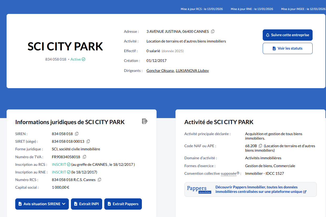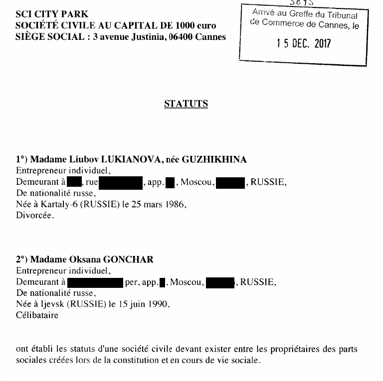 Фирма SCI CITY PARK оформлена на Gonchar Oksana и некую LUKIANOVA Liubov. Видимо, еще одна родственница или доверенное лицо.