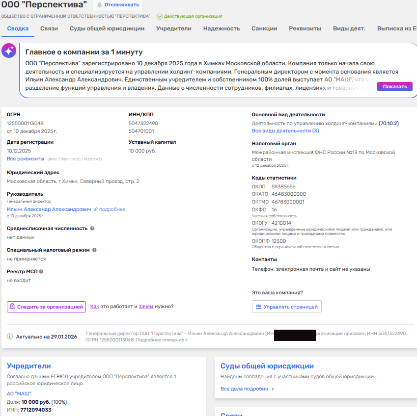 Юридическим покупателем аэропорта и всего причитающегося стало ООО «Перспектива», созданное 10 декабря 2025 года с минимальным уставным капиталом 10 тыс. рублей. Директор технического актива - адвокат Александр Ильин, совладелец ит-компании «ВФМ Технолоджи», прописанной в Сколково.
