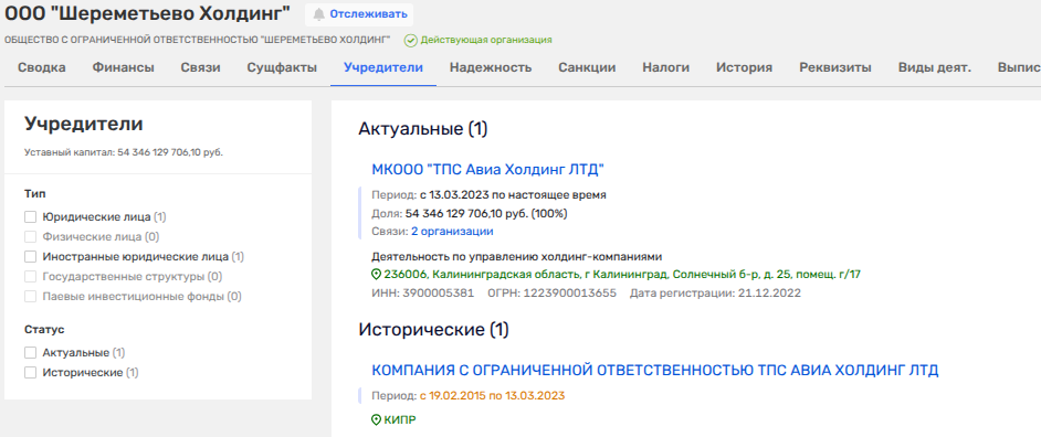 По последним открытым данным, основными акционерами МАШ были ООО «Шереметьево холдинг» и Росимущество. При этом на ООО приходилось свыше 66%, а стоял за фирмой кипрский офшор - ТПС АВИА ХОЛДИНГ ЛТД, который в марте 2023 года превратили в российский офшор МКООО «ТПС Авиа Холдинг ЛТД» и сразу же стали скрывать его владельцев.